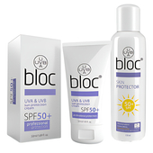 Zestaw do opalania - BLOC - bloker SPF 50+, mgiełka Reascue i żel Gold Shimmer po opalaniu
